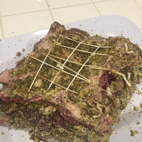 After seasoning the roast and bone you will need to tie them back together. Using butcher string tie the bones back onto the roast. And then place into a deep pan.